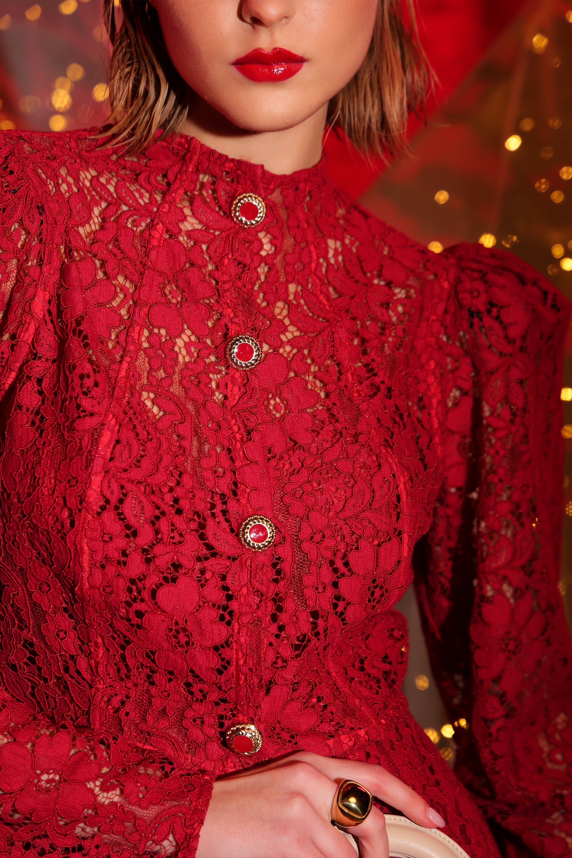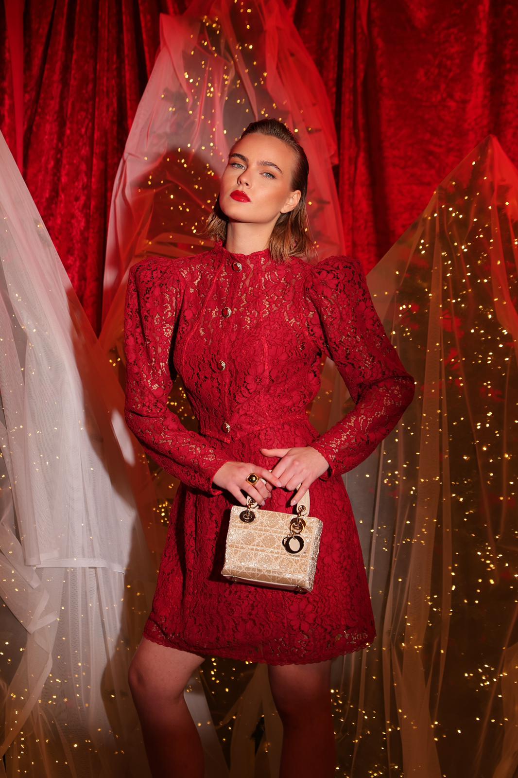 L'Abito Camille incarna eleganza sofisticata con il suo design in pizzo cigliato arricchito da dettagli sulle coppe e sulla gonna. Le sottilissime bretelle esaltano le spalle e valorizzano il décolleté, mentre la chiusura invisibile con gancetto garantisce praticità e discrezione. Il giacchino coordinato, caratterizzato da maniche a sbuffo e collo coreano strutturato, definisce la silhouette con precisione. L'abbottonatura gioiello con derraglio smaltato in tono completa un'opera di sartoria ricercata, perfetta per occasioni speciali dove versatilità e raffinatezza si incontrano.