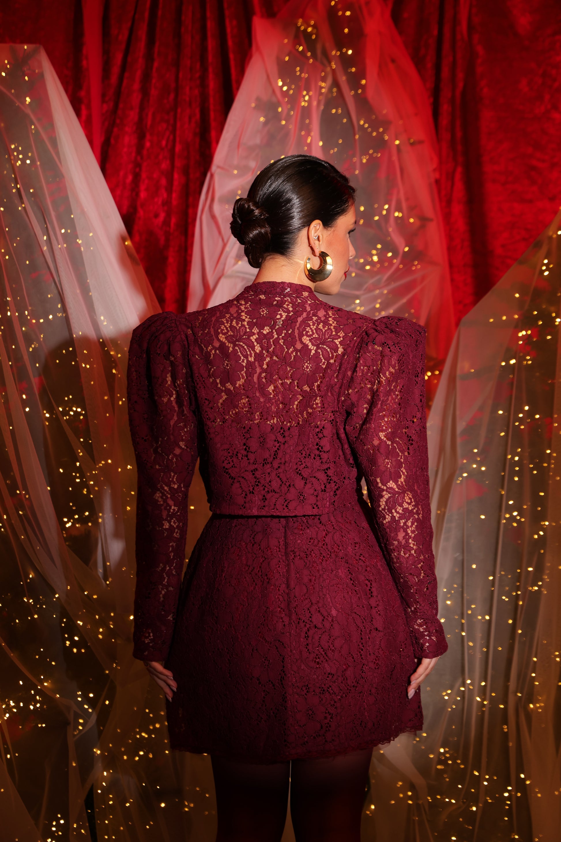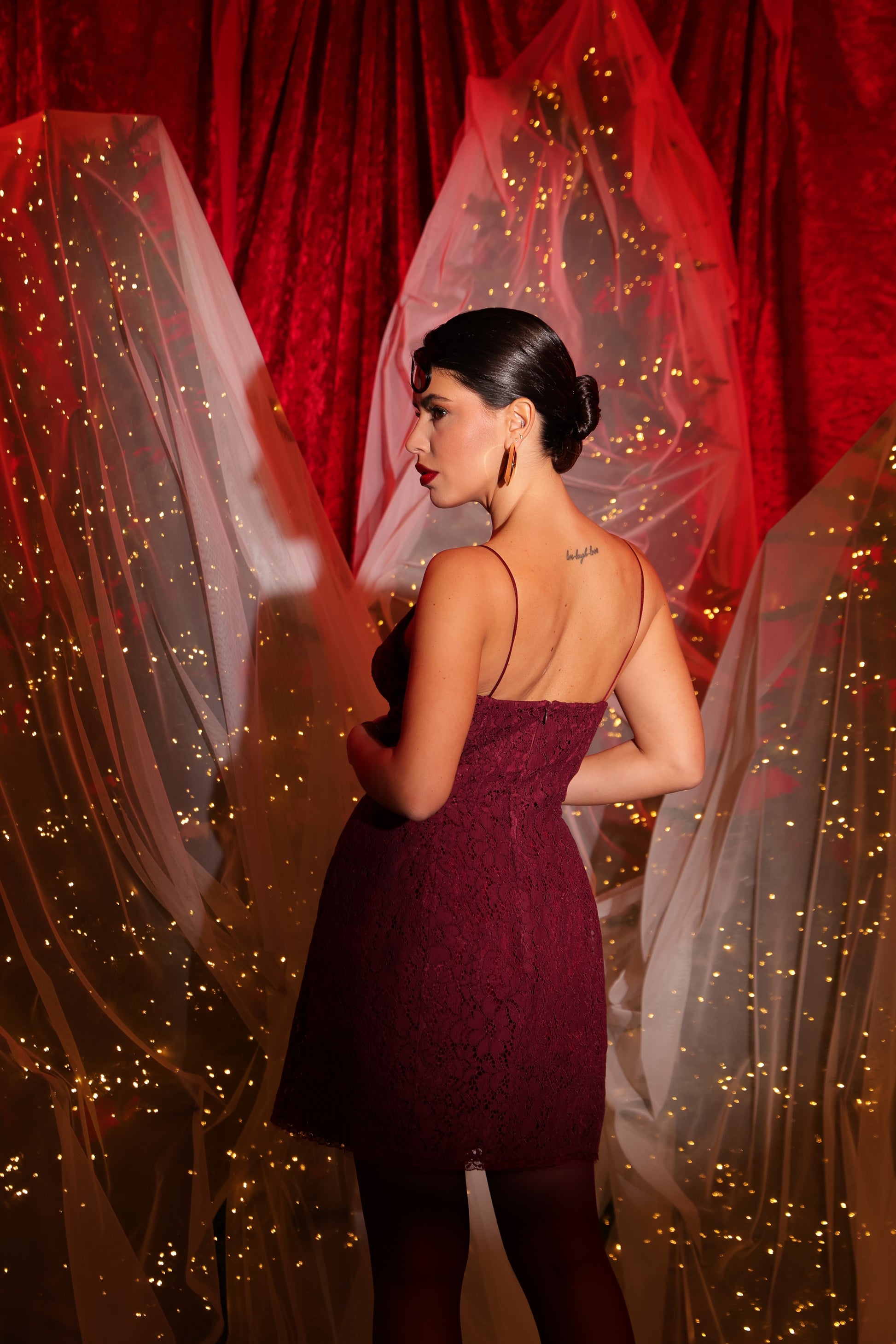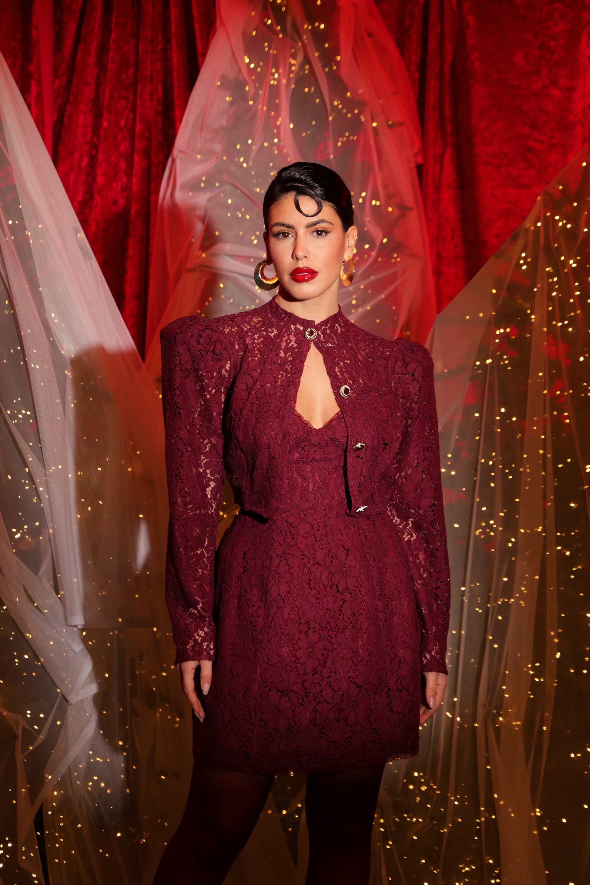 L'Abito Camille incarna eleganza sofisticata con il suo design in pizzo cigliato arricchito da dettagli sulle coppe e sulla gonna. Le sottilissime bretelle esaltano le spalle e valorizzano il décolleté, mentre la chiusura invisibile con gancetto garantisce praticità e discrezione. Il giacchino coordinato, caratterizzato da maniche a sbuffo e collo coreano strutturato, definisce la silhouette con precisione. L'abbottonatura gioiello con derraglio smaltato in tono completa un'opera di sartoria ricercata, perfetta per occasioni speciali dove versatilità e raffinatezza si incontrano.