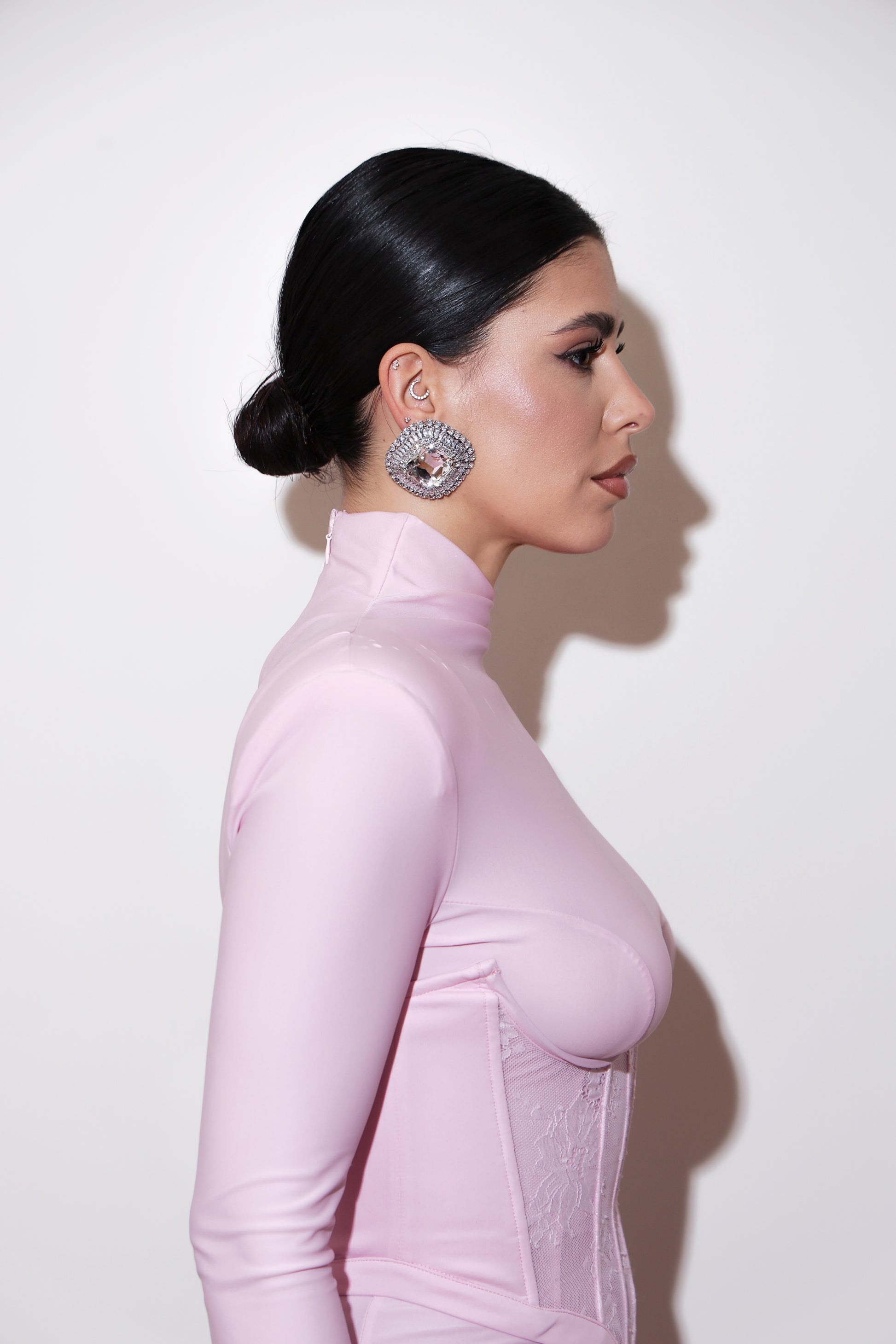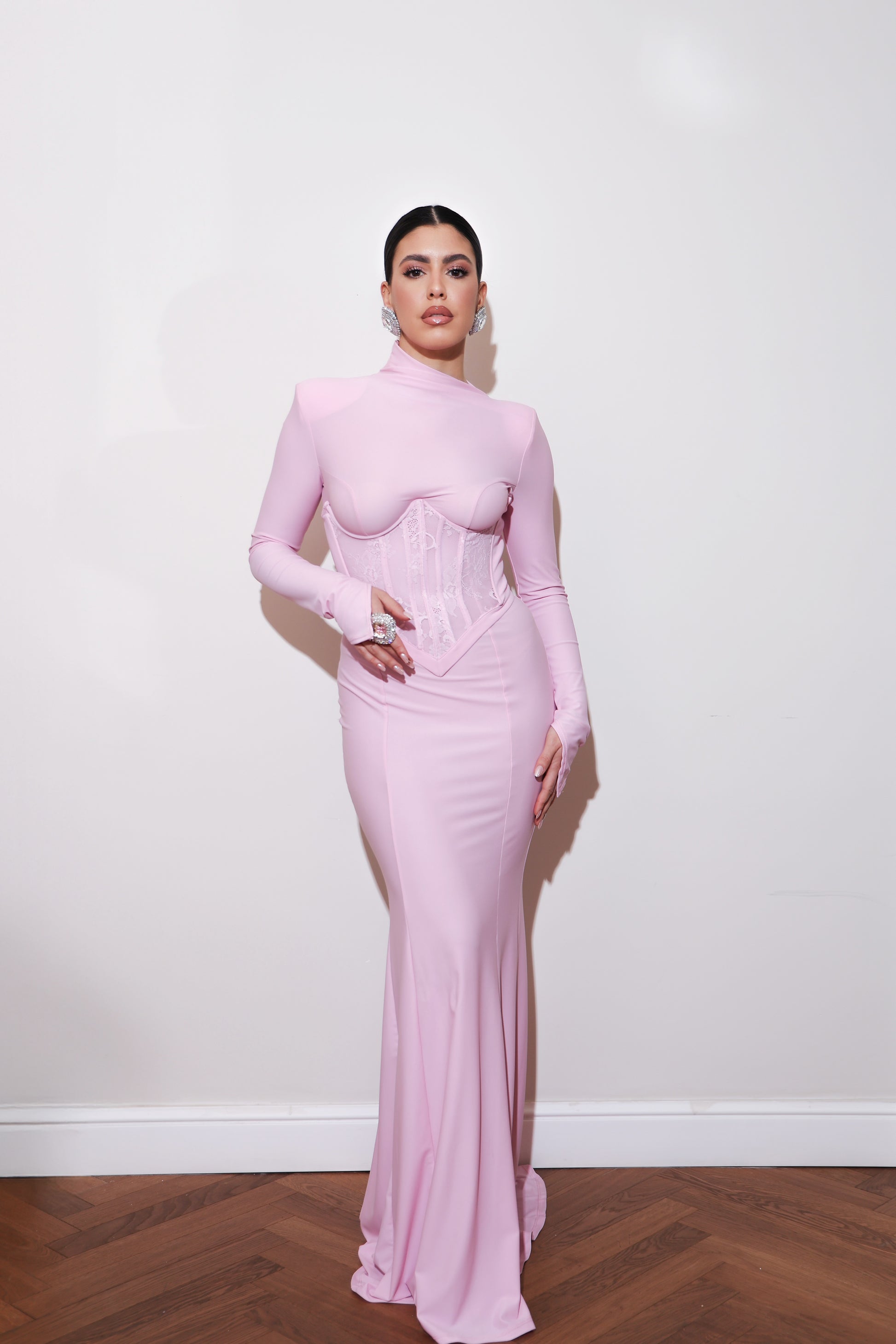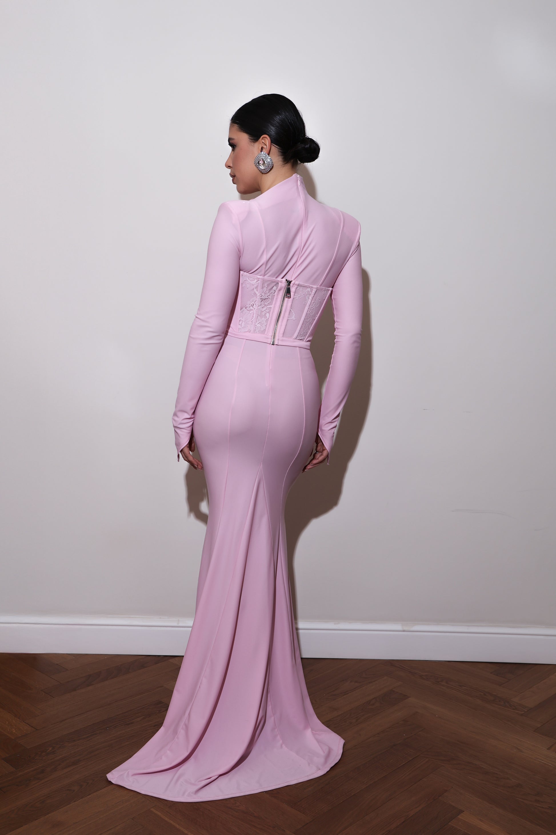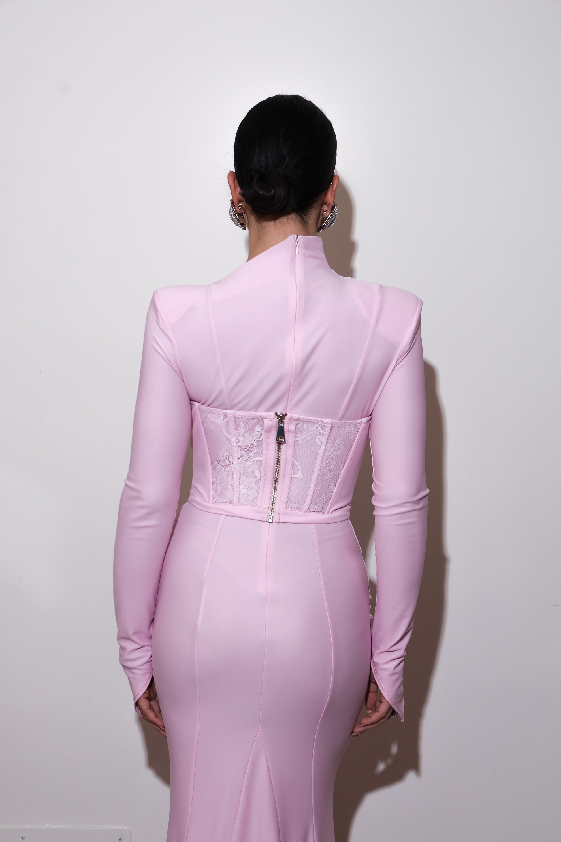 Eleganza senza compromessi che fonde il romanticismo retrò con la modernità contemporanea. Questo abito a sirena affascina con spalline imbottite che definiscono le spalle, dolcevita asimmetrico che crea movimento e manica lunga a guanto asimmetrica per un tocco sofisticato. Il corpetto strutturato con ferretto e stecche garantisce una silhouette impeccabile, mentre i dettagli in pizzo aggiungono sensualità. La chiusura con zip invisibile sul retro assicura una vestibilità perfetta, completata dalla lampo del bustino. Un capo che cattura l'essenza del vintage con un'anima decisamente contemporanea, ideale per chi ricerca unicità e raffinatezza.