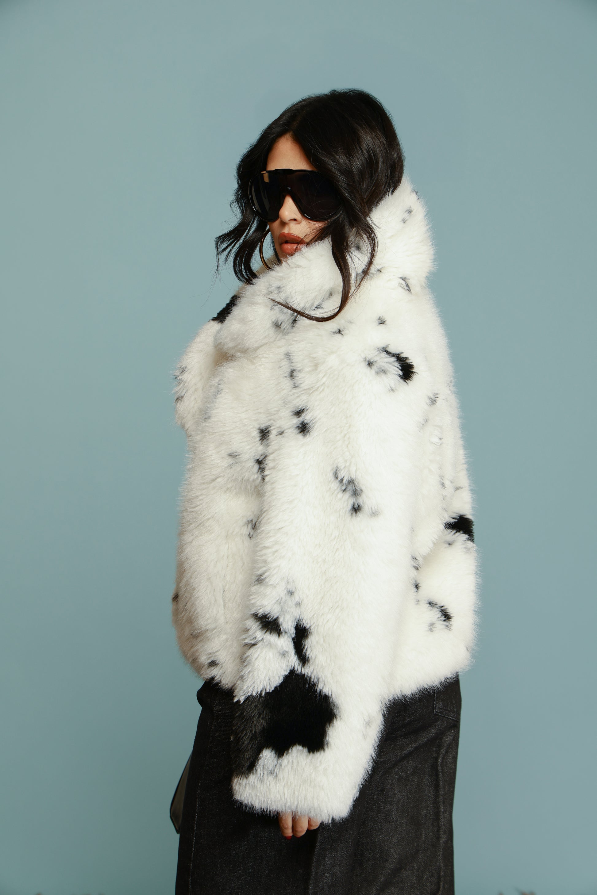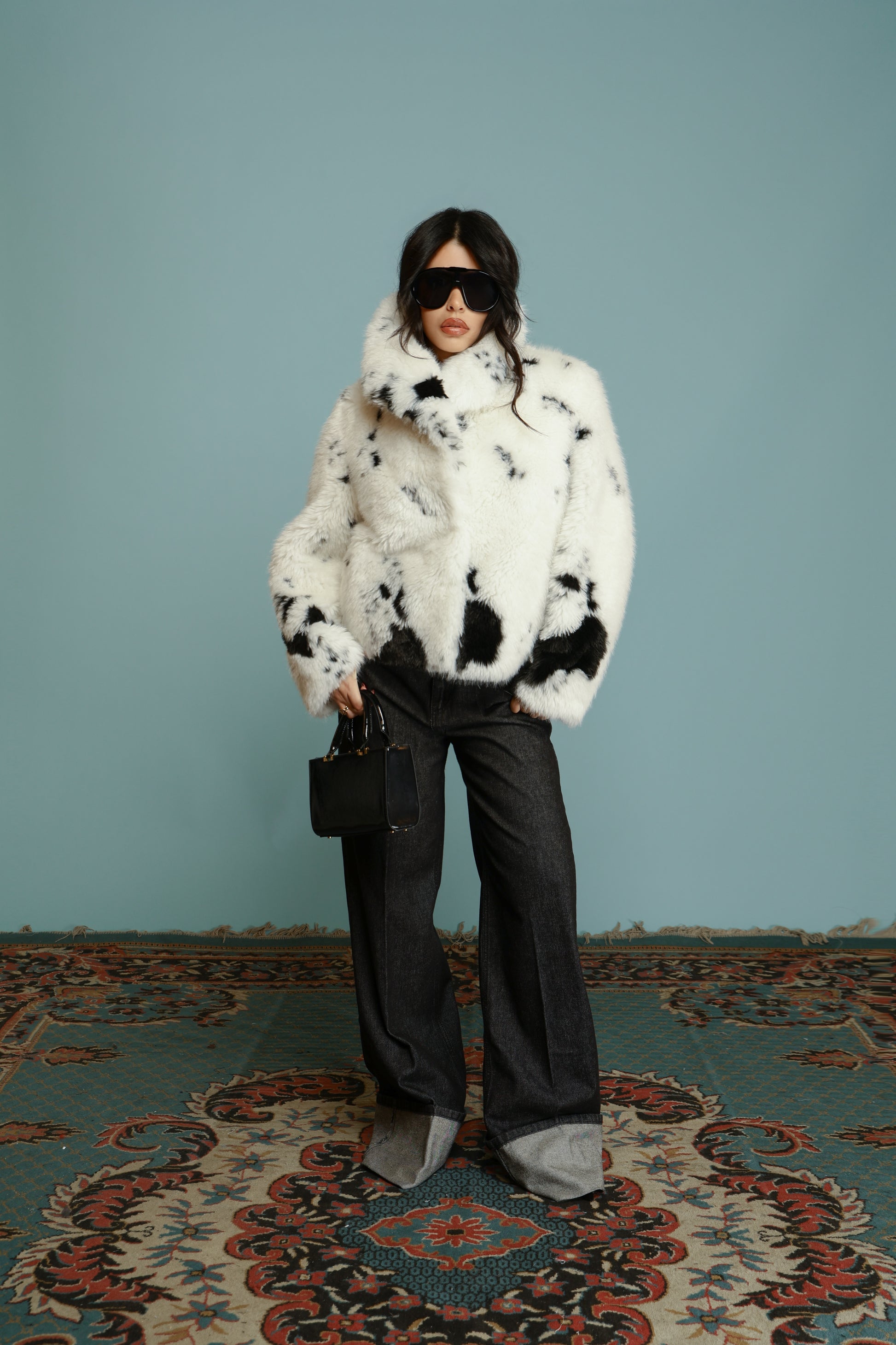 Bomber in ecopelliccia con affascinante pattern animalier bianco e nero, perfetto per chi ricerca stile audace e consapevolezza ambientale. Il collo avvolgente garantisce calore e comfort, mentre l'abbottonatura con bottoni a pressione in metallo assicura praticità e durabilità. Le tasche laterali offrono funzionalità quotidiana, e il rivestimento interno in ecomontone aggiunge morbidezza e isolamento termico. Un capo versatile che unisce estetica contemporanea e materiali sostenibili, ideale per completare look casual e urban con personalità.