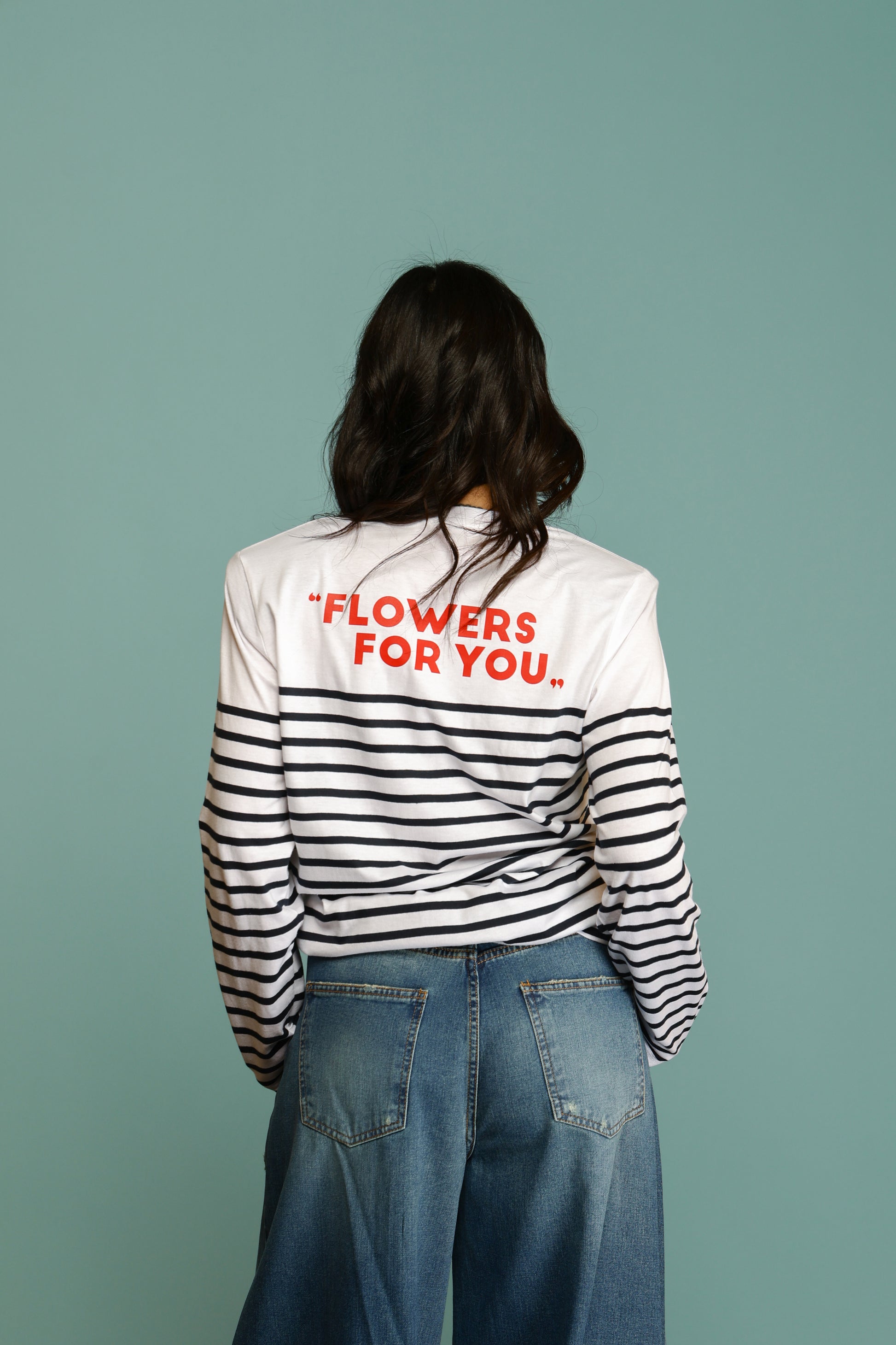 T-shirt versatile in cotone 100% con trattamento enzimatico che garantisce una morbidezza superiore e una sensazione piacevole sulla pelle. Taglia unico con vestibilità over che si adatta a diverse morfologie, perfetto per uno stile rilassato e contemporaneo. Spallina imbottite per maggior comfort e dettagli a righe a contrasto che aggiungono carattere. Il logo papavero sul lato cuore e la stampa "flowes for you" sulle spalle completano il design, rendendola un capo versatile da indossare in molteplici occasioni.