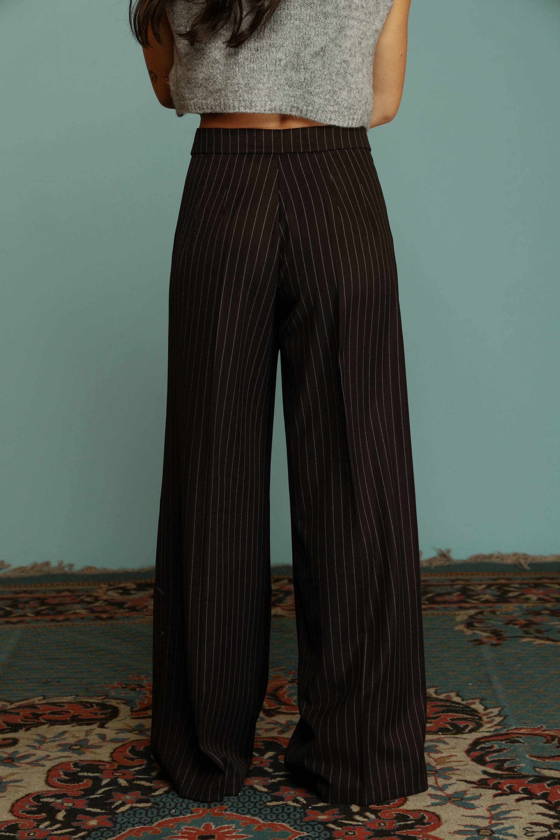 Elegante tailleur doppio petto in tessuto gessato, caratterizzato da un raffinato petto a lancia e bottone interno per un'estetica sofisticata. La spallina imbottita di 3 cm garantisce una silhouette strutturata e definita, mentre i bottoni in metallo aggiungono un dettaglio di qualità. La giacca completamente foderata assicura comfort e durabilità nel tempo. Il pantalone palazzo, con vestibilità regolare, presenta un'abbottonatura anteriore pratica tramite zip e bottone. Un capo versatile e senza tempo, ideale per occasioni formali e contesti professionali.
