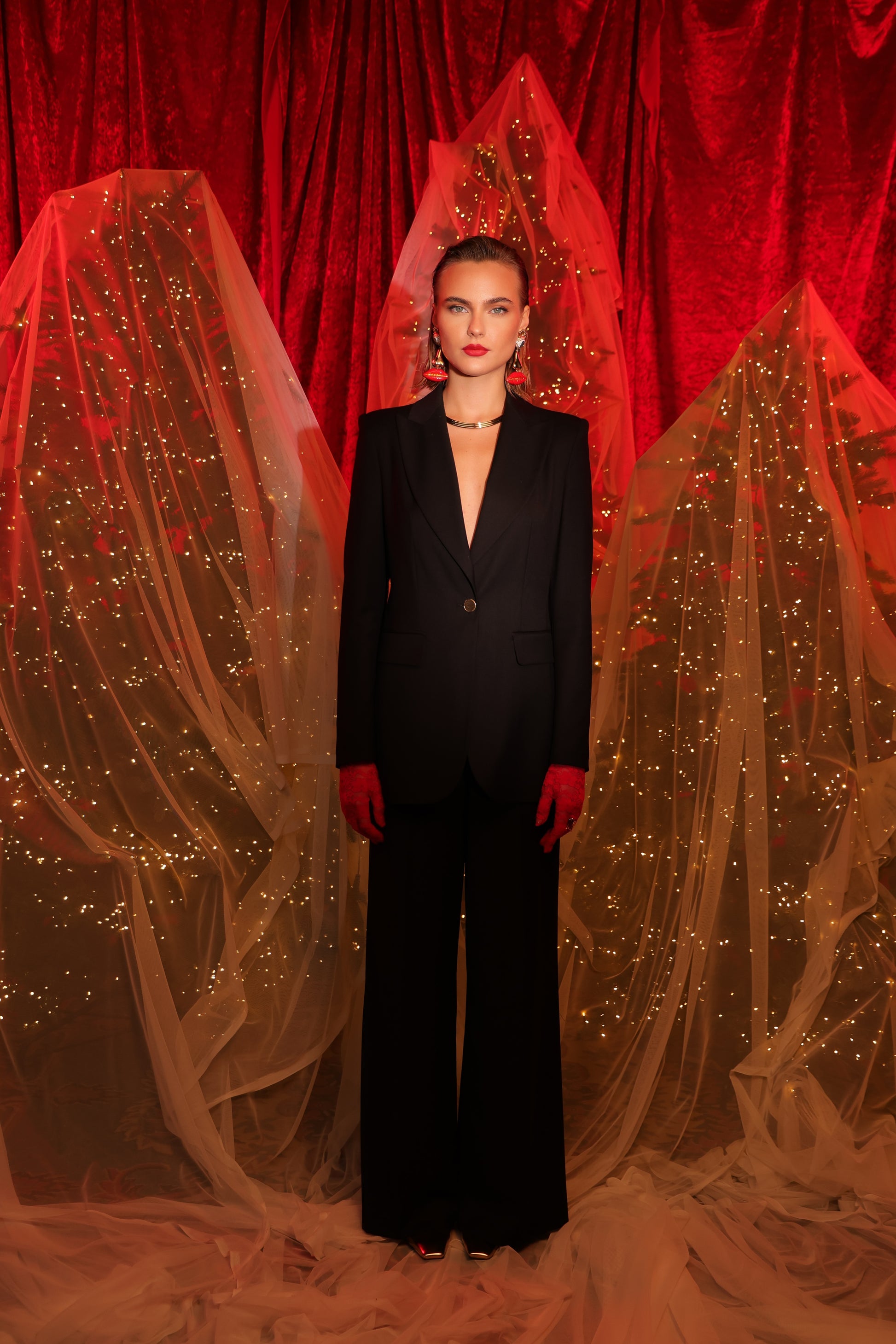 Elegante tailleur monopetto, caratterizzato da un raffinato petto a lancia. La spallina imbottita di 3 cm garantisce una silhouette strutturata e definita, mentre i bottoni in metallo aggiungono un dettaglio di qualità. La giacca completamente foderata assicura comfort e durabilità nel tempo. Il pantalone palazzo, con vestibilità regolare, presenta un'abbottonatura anteriore pratica tramite zip e bottone. Un capo versatile e senza tempo, ideale per occasioni formali e contesti professionali.